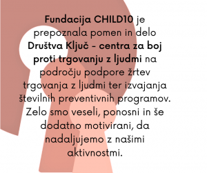 Švedska fundacija CHILD10 je prepoznala pomen in delo Društva Ključ na področju podpore žrtev trgovanja z ljudmi v Sloveniji ter izvajanja številnih preventivnih programov. Zelo smo veseli, ponosni in še dodatno motivirani, da nadaljujemo z našimi aktivnostmi.